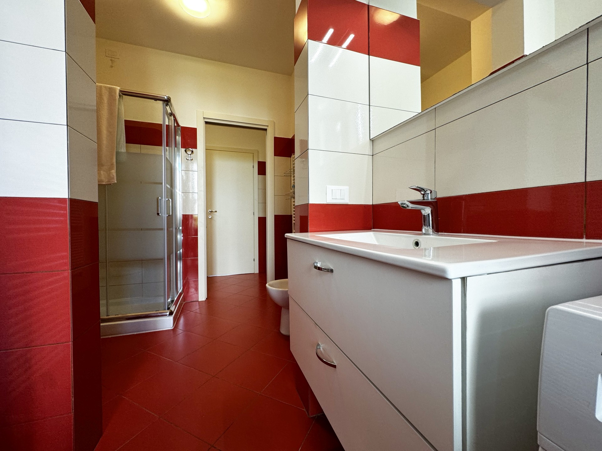 La casa dispone di un ampio open space con cucina attrezzata e soggiorno, una camera matrimoniale, una camera doppia con due letti singoli, ed un bagno diviso in tre spazi, caratterizzato da un antibagno e una zona lavanderia che affaccia direttamente in una delle due terrazze. Una terrazza affaccia sul Castello Svevo e l’altra, con un tavolino e due sedie, tra i vicoli di Porto Recanati.